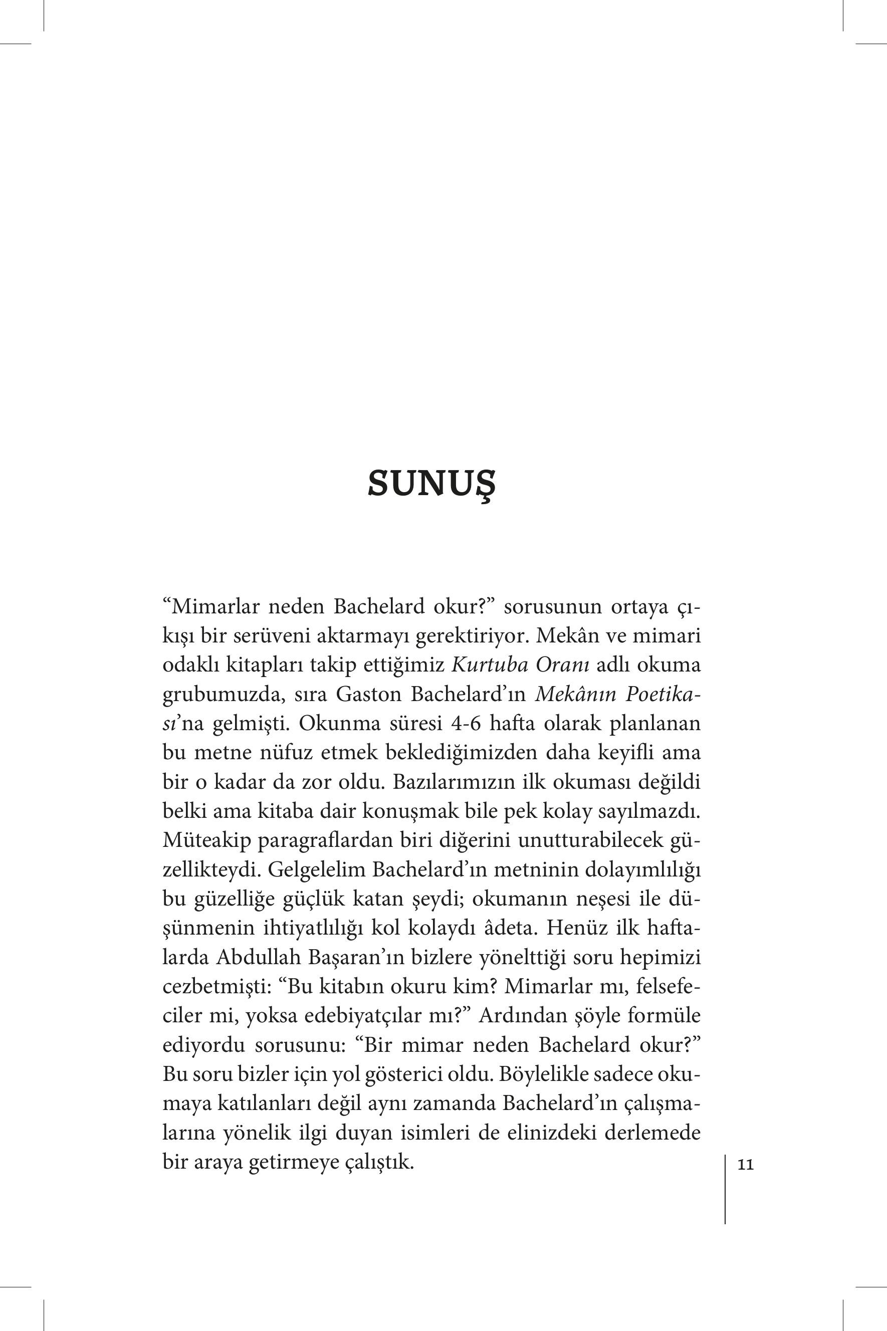 Gaston Bachelard’ın hayranlık uyandıran mekân çalışmalarını farklı disiplinlerle birlikte kat etmeyi amaçlayan bu kitap, okurunu hem Bachelard’la hem de onun felsefi, edebi, mimari, tasarım yorumlarıyla buluşturuyor. Farklı disiplinlerin “mekân” fikrinden hareketle aslında sadece mimari için değil ilgili her disiplin için sorulması gereken soruyu gündeme getiriyor: “Mimarlar neden Bachelard okur?” Elinizdeki derleme barındırdığı metin ve görsel çeşitliliğiyle mekânların ritmini bulmaya çalışıyor. Mimari, felsefe ve edebiyat meraklısı okurların keyifle peşine düşeceği bir serüven sunduğumuzu düşünüyoruz.