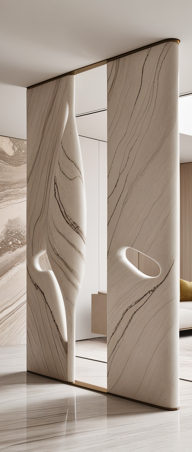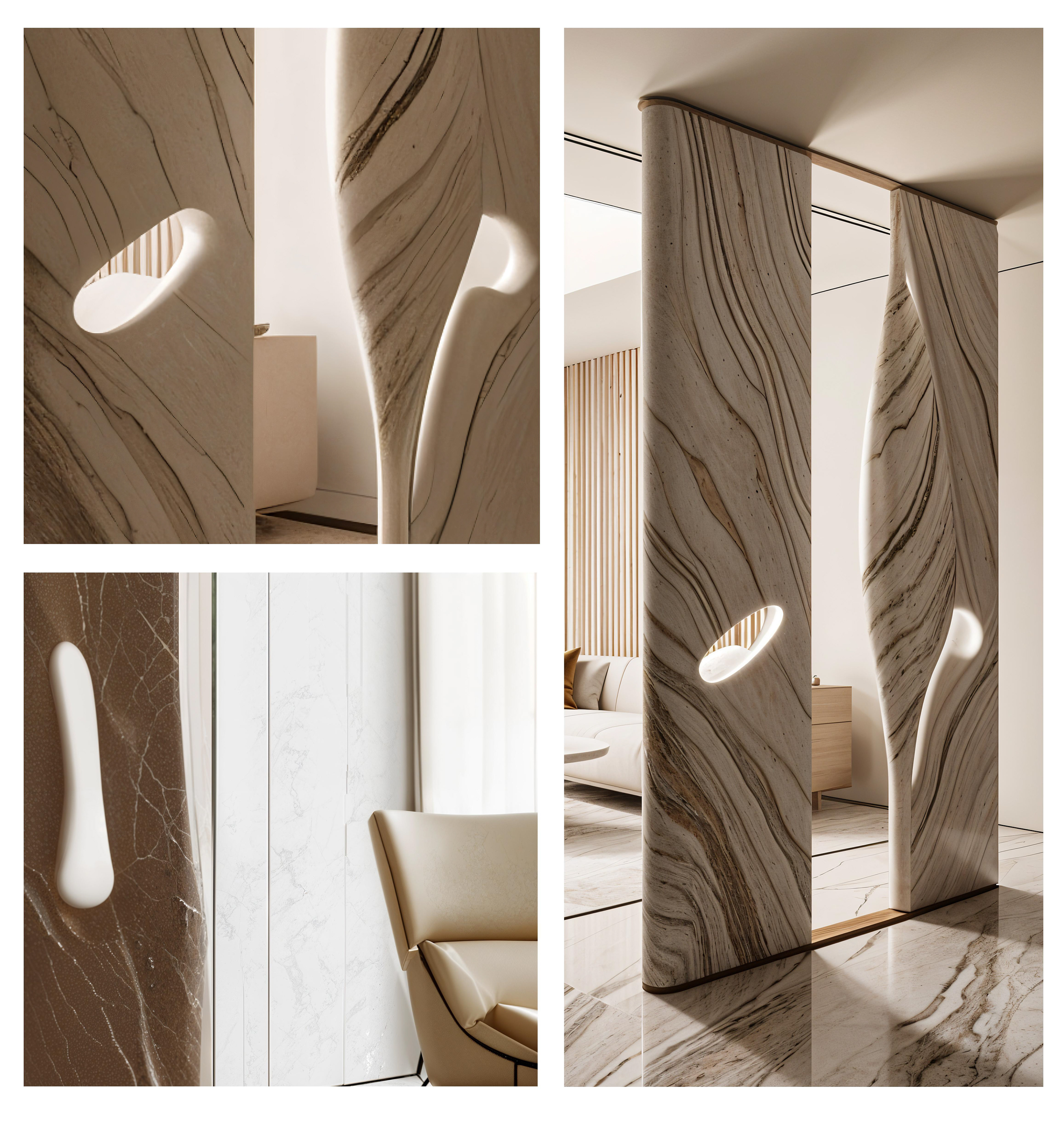 Vena is a sculptural partition panel that reinterprets abstract and futuristic forms through the timeless character of natural stone. With its morphology inspired by organic structures, the design emphasizes the integration of raw materials and contemporary fabrication technologies. Shaped by curvilinear inner contours and hollow transitions, Vena transforms a solid stone mass into a sensory and structural expression. It is not merely a partition element; it also carries a strong artistic form. Standing at 3 meters in height, the piece evokes interaction, reflection, and movement—serving as both a functional spatial divider and an architectural sculpture in interior or exterior environments. Crafted from marble or other alternative natural stones, Vena is internally reinforced with a concealed metal framework. The stone is first roughly shaped using 5-axis CNC milling machines, and then refined by hand to achieve smooth cavities and seamless transitions. The natural veining of the stone is meticulously aligned with the flow of the form, enhancing the conceptual coherence both visually and materially.