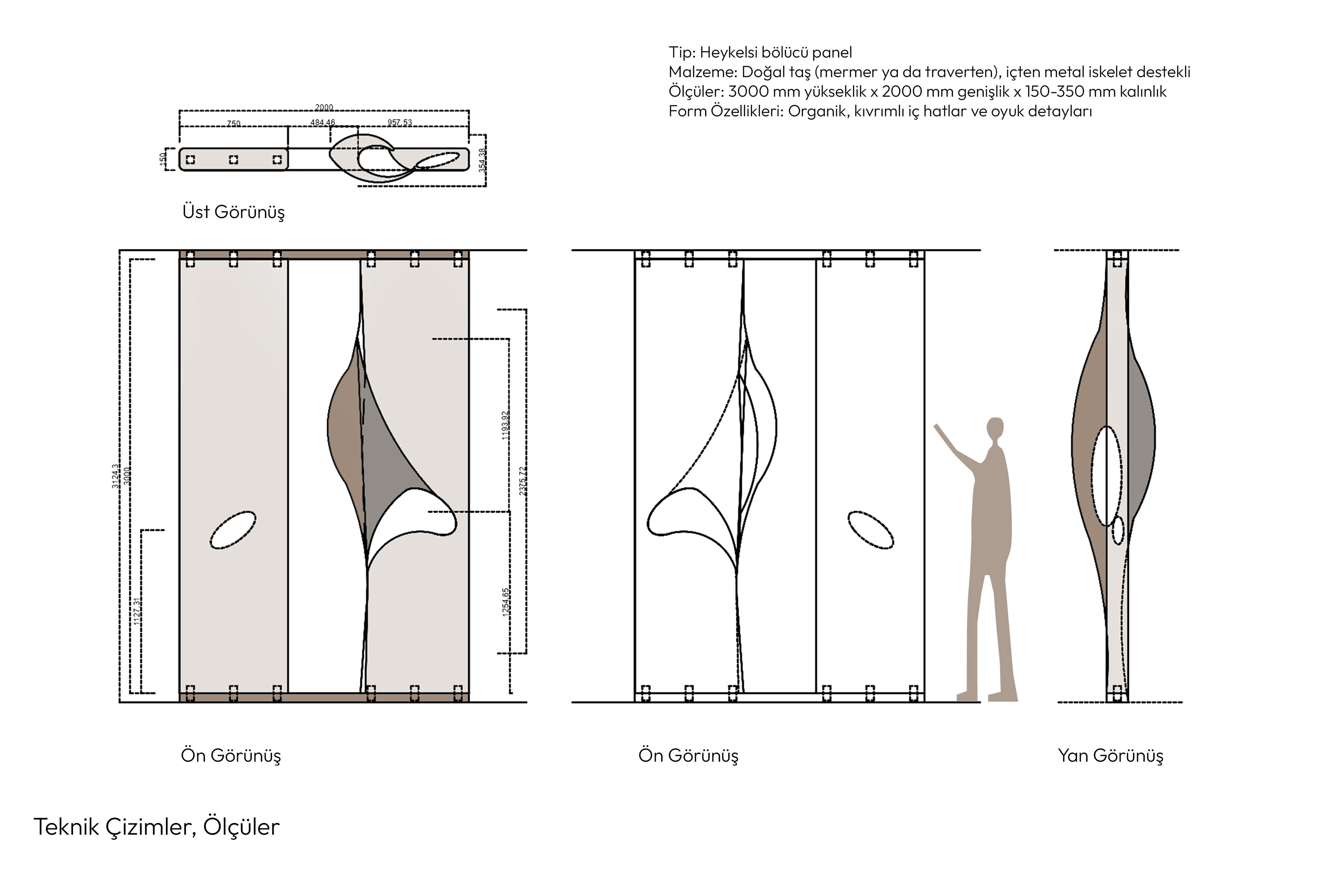 Vena, soyut ve geleceğe ait formları doğal taşın zamansız karakteriyle yeniden yorumlayan heykelsi bir bölücü paneldir. Tasarım, organik morfolojiden ilham alan görüntüsüyle, doğal malzeme ile çağdaş üretim teknolojilerinin entegrasyonunu vurgular. Kıvrımlı iç hatları ve oyuk geçişleriyle şekillenen Vena, katı bir taş kütlesini duyusal ve yapısal bir ifadeye dönüştürür. Sadece bir bölücü eleman değil; aynı zamanda bir sanatsal bir form taşır. 3 metre yüksekliğiyle bu parça, etkileşim, yansıma ve hareketi duyumsatır; hem iç hem dış mekânlarda yer alarak işlevsel bir ayrım unsuru ve mimari bir heykel görevi üstlenir. Mermer ya da farklı alternatif doğal taşlardan üretilen Vena, içten gizli bir metal iskeletle desteklenir. Taş, önce 5 eksenli CNC makineleriyle kabaca şekillendirilir; ardından el işçiliğiyle oyuklar ve geçişler pürüzsüz bir şekilde tamamlanır. Doğal damar yönü formun akışıyla hassas biçimde örtüştürülür, bu da kavramsal bütünlüğü hem görsel hem de maddesel olarak güçlendirir. Yüzey seçenekleri mat, ipek mat veya parlak olarak uygulanabilir; ayrıca leke ve nem dayanımı için koruyucu emprenye işlemi yapılır. Gizli montaj detayları sayesinde yerleştirildiği yüzeyle bütünleşir. Vena, malzemenin hafızası ile hayal edilen gelecek arasında bir diyalogdur—doğanın niyete, heykelin mekâna dönüştüğü noktada durur.